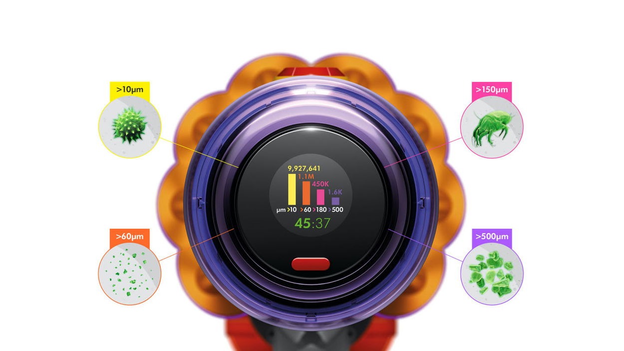 Vědecký důkaz čištění: LCD displej v reálném čase zobrazuje velikost a počet nasátých částic, což poskytuje vizuální potvrzení o důkladnosti úklidu.