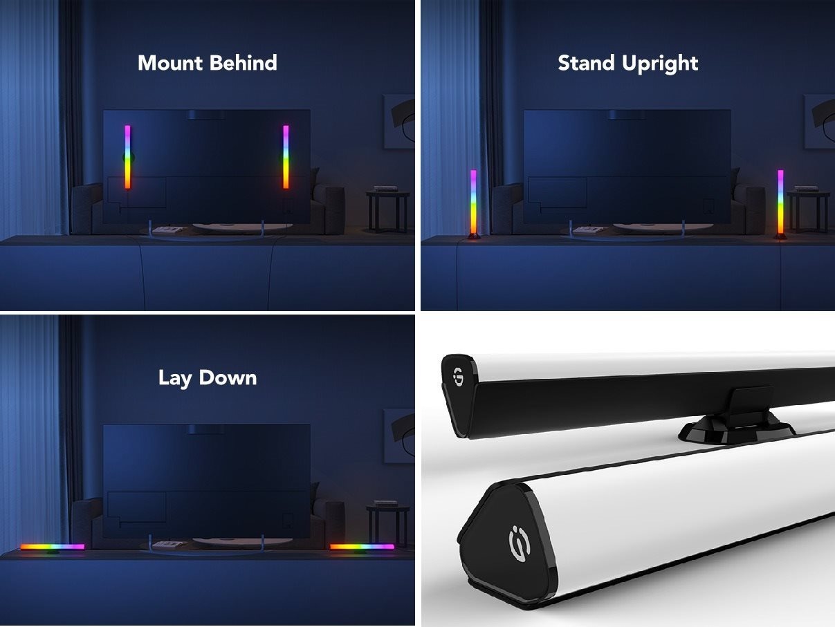 Panely můžeš instalovat horizontálně, vertikálně nebo jako podsvícení na zadní stranu TV (určeno pro úhlopříčky zhruba 43–75"). Rozměry jednoho panelu jsou cca výška 38 cm a šířka 3,5 cm, průměr podstavce je kolem 8 cm. V balení najdeš 2× panel, ovládací box, napájecí adaptér, držáky na stůl i na obrazovku a pěnové nálepky pro uchycení.