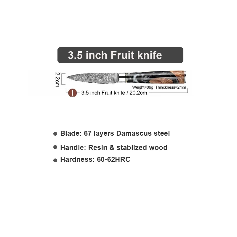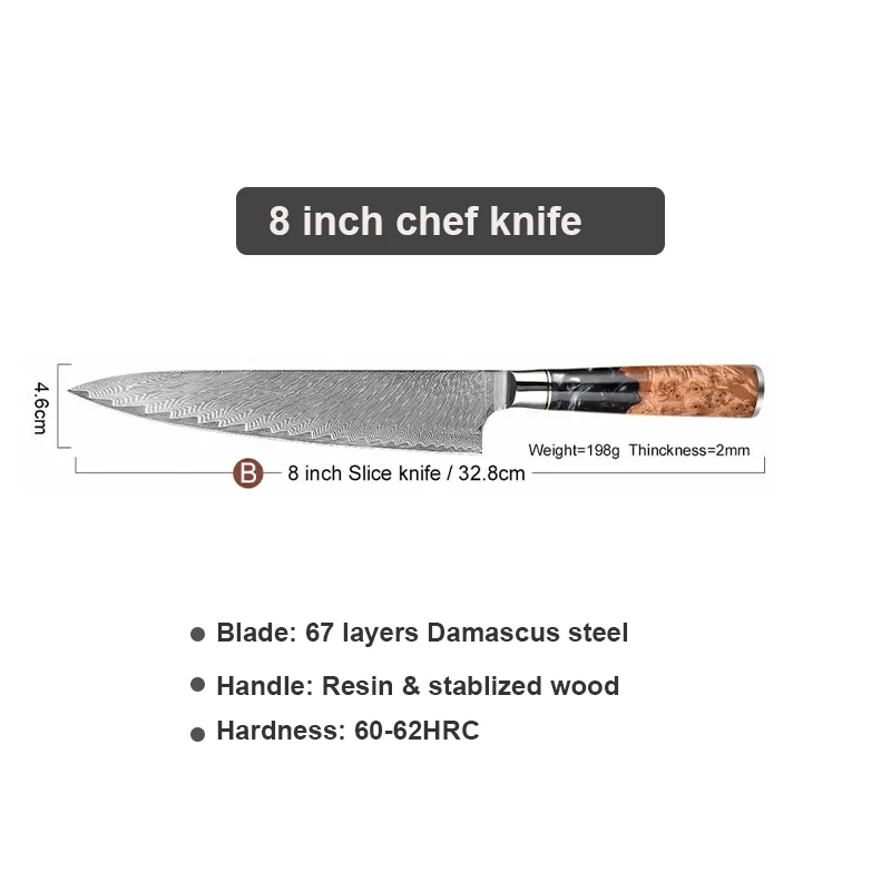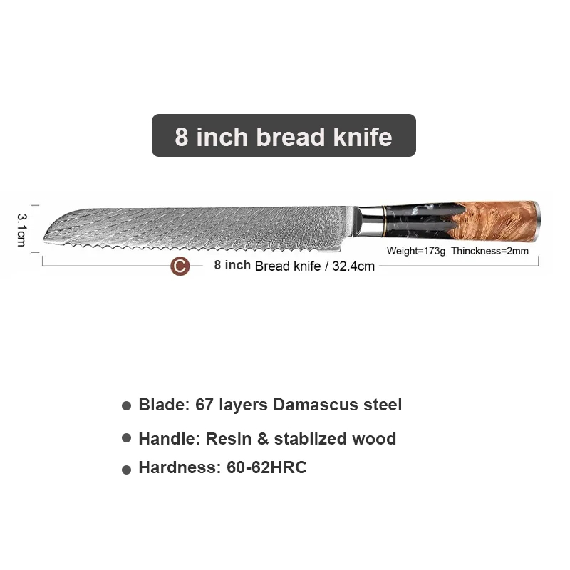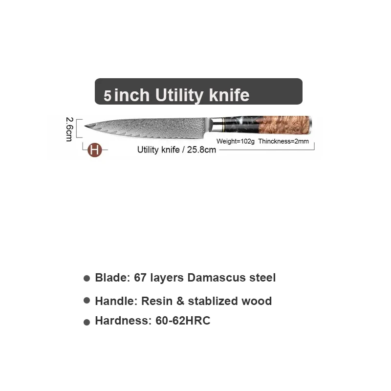 Každý nůž má čepel z 67 vrstev damaškové oceli s tvrdostí 60-62 HRC, což zajišťuje extrémní ostrost, vysokou pevnost a odolnost proti korozi. Tento materiál je ideální pro domácí i profesionální použití díky dlouhodobé udržitelnosti ostří a estetickému vzoru. S tloušťkou čepele kolem 2 mm a V-edge řezem řeže s minimálním úsilím.