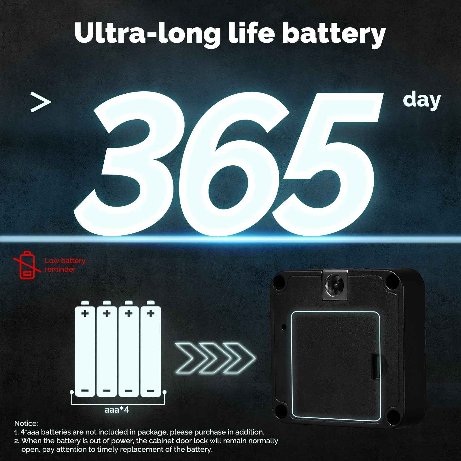 - Nízká spotřeba energie: Zámek je napájen bateriemi (3x AAA, nejsou součástí balení), které vydrží až 6-8 měsíců běžného používání. Indikátor slabé baterie vás včas upozorní na nutnost výměny.
