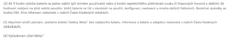 Oakley Meta Vanguard disponují certifikací IP67, což zajišťuje odolnost proti prachu, vodě, potu a extrémním teplotám. Výdrž baterie je deklarována až 9 hodin běžného používání nebo 6 hodin nepřetržitého přehrávání zvuku. Nabíjecí pouzdro s vlastním akumulátorem přidává dalších 36 hodin výdrže, přičemž plné nabití trvá 75 minut