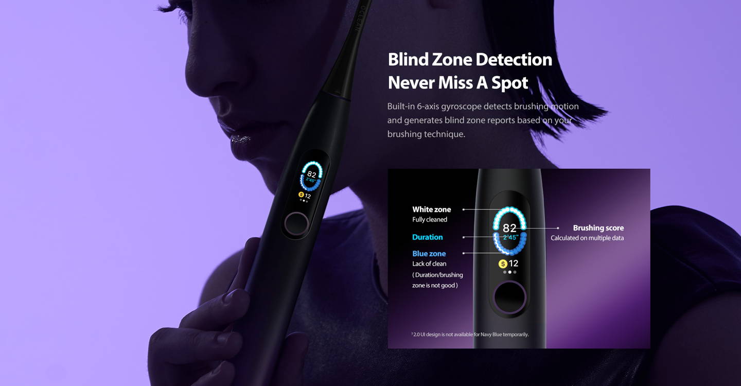 Kartáček je vybaven 6osým gyroskopem, který je určen k monitorování a registraci 8 zón v ústech.