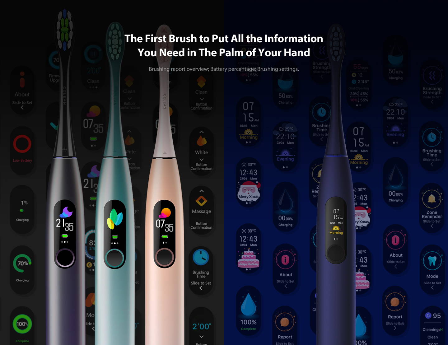 Sonický zubní kartáček Oclean X Pro je vybaven 0,96 palcovou dotykovou obrazovkou, což je velice užitečné i přes malé rozměry. Můžete si také přímo zkontrolovat čas čištění a stav zubního kartáčku a změnit nejdůležitější nastavení zubního kartáčku, aniž byste museli jít přímo do aplikace.
