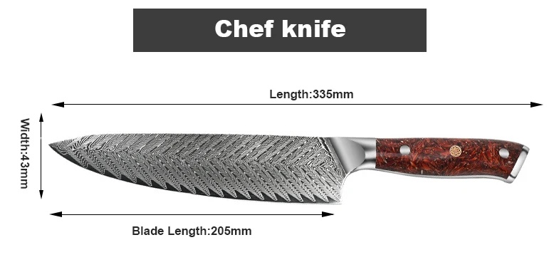 8palcový šéfkuchařský nůž představuje špičkový nástroj pro každodenní kuchyňskou přípravu, který kombinuje tradiční řemeslo s moderními materiály a designem. Tento nůž je navržen tak, aby poskytoval maximální pohodlí a spolehlivost při krájení masa, ryb, zeleniny, bylinek nebo přípravě sushi a omáček. Jeho čepel z 67 vrstev VG-10 damaškové oceli s peřím vzorem je známá neuvěřitelnou ostrostí, odolností a schopností udržet ostrý řez po dlouhou dobu. Rukojeť z červené Scarlet Resin pryskyřice se stabilizovaným dřevem, nýty a nerezovými komponenty zajišťuje pohodlí i estetický zážitek v každé kuchyni.
