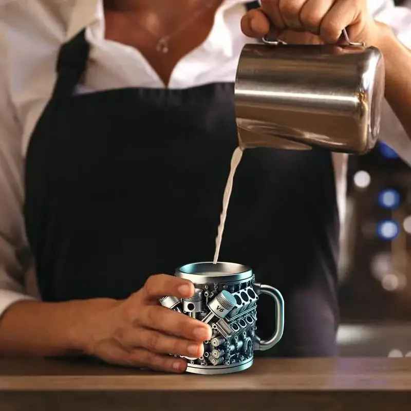 Hľadáte dokonalý doplnok do svojej dielne, kancelárie alebo garáže? Tento nerezový hrnček kombinuje industriálnu estetiku s praktickou funkčnosťou. Jeho povrch zdobí detailná grafika inšpirovaná svetom motorov, čo z neho robí ideálny darček pre každého kutila alebo milovníka techniky.
