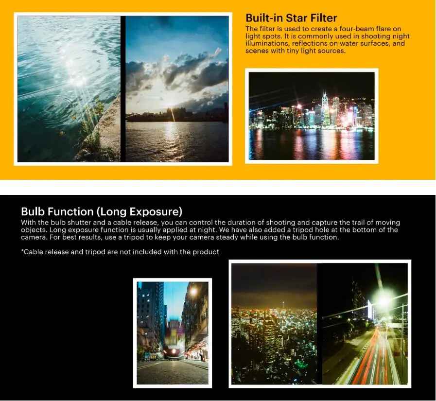 KODAK EKTAR H35N nadväzuje na úspešný model H35 a prináša niekoľko kľúčových vylepšení pre ešte lepší zážitok z fotenia. Objektív s optickým členom z akrylového skla s asférickým dizajnom zaisťuje ostrejšie zábery s bohatšími detailmi. Fotoaparát je vybavený vstavaným hviezdnym filtrom, ktorý dodá vašim nočným fotografiám s jasnými zdrojmi svetla jedinečný a umelecký nádych hviezdneho záblesku. Stačí ho otočiť a premení sa z bežnej fotografie na magický záber.