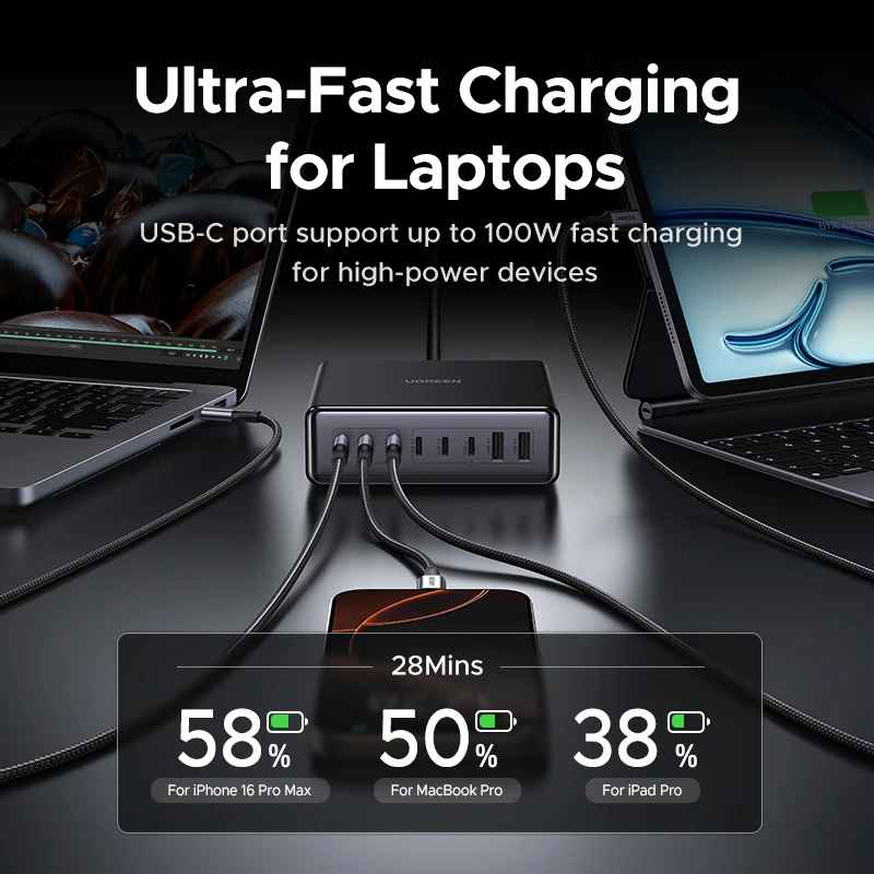 Vďaka pokročilej technológii GaN (nitrid gália) je táto nabíjačka výrazne menšia a ľahšia ako tradičné nabíjačky s podobným výkonom, čo ju robí ideálnym spoločníkom na cesty aj do kancelárie. Zabudnite na nosenie mnohých adaptérov – jedna Ugreen 200W GaN nabíjačka stačí pre kompletné nabíjacie riešenie.